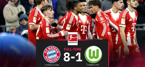 จบเกม บาเยิร์น มิวนิค งัดฟอร์มหรูประเดิมศักราชใหม่ด้วยการเปิดบ้านไล่ต้อนเอาชนะ โวล์ฟสบวร์ก ขาดลอย 8-1 คว้าสามแต้มนำจ่าฝูงโด่ง 44 คะแนน ทิ้ง ดอร์ทมุนด์ ไกลถึง 11 แต้ม หลังผ่าน 16 นัด ส่วนทัพหมาป่าเมืองเบียร์แต้มหยุดที่ 15 คะแนนรั้งอันดับ 14 ของตาราง