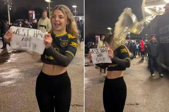 แฟนสาวสโมสรแมนเชสเตอร์ ยูไนเต็ด ซึ่งเป็นครีเอเตอร์คอนเทนต์ผู้ใหญ่ ถูกสาดเบียร์จนตัวเปียกโชก หลังจากเธอล้อเลียนแฟนบอลเวสต์แฮม ยูไนเต็ด นอกสนามเหย้าของทีม