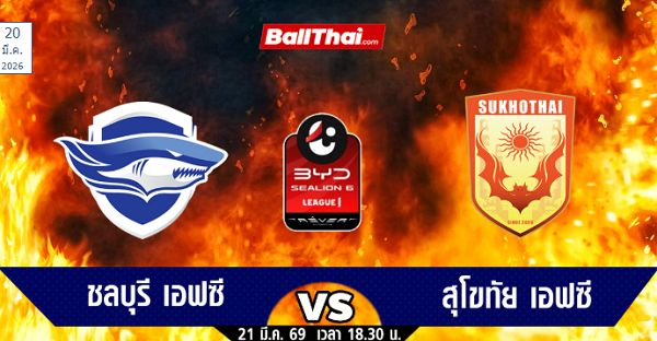 วิเคราะห์ฟุตบอลไทยลีก ฤดูกาล 2025/26 นัดที่ 26 คู่ระหว่าง ชลบุรี เอฟซี ทีมอันดับ 10 เปิดสนามชลบุรี ไดกิ้น สเตเดียม รับการมาเยือนของ สุโขทัย เอฟซี ทีมอันดับ 12 ในวันศุกร์ที่ 21 มีนาคม 2569 เวลา 18.30 น. ถ่ายทอดสดทาง AIS PLAY และ Monomax